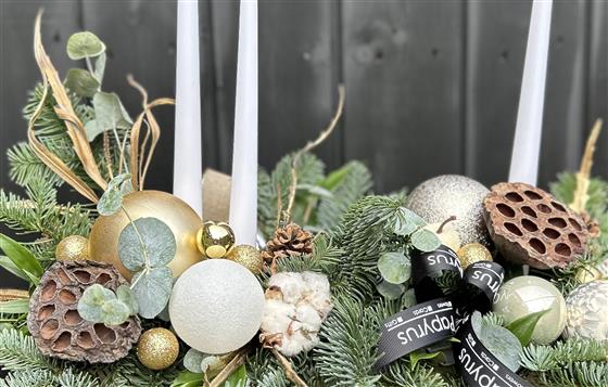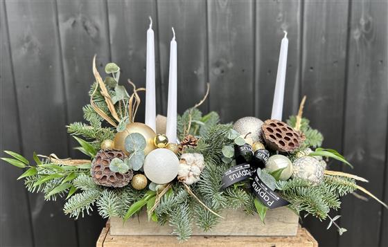 A longer oblong taper candle table decoration. Available in GOLD, RED and Silver