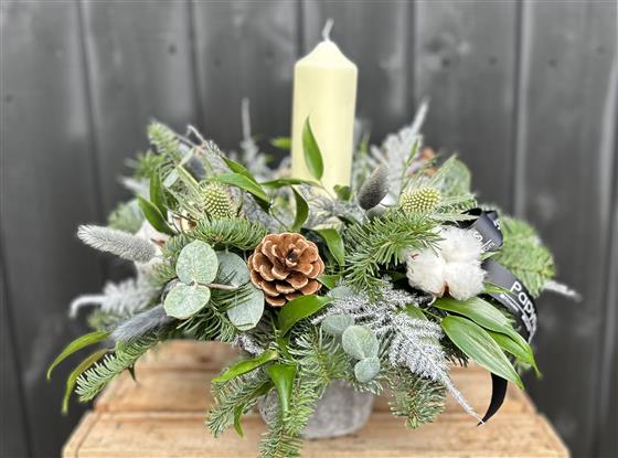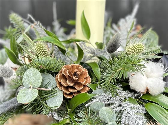 Traditional round pillar candle table decoration, available in SILVER, RED and GOLD.