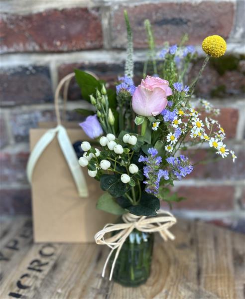 Small glass vase with a mixture of seasonal flowers and foliage.