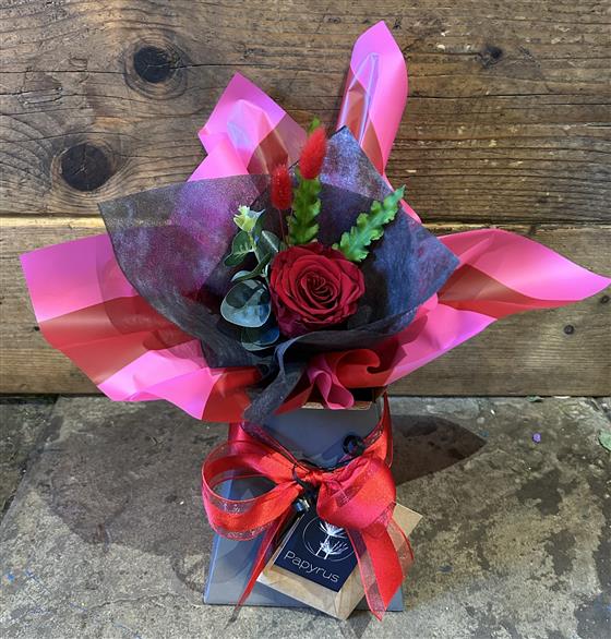 Eternal everlasting boxed rose in low arrangement. These roses have been freeze dried and preserved so will last forever. Box wrapped as image with card and ribbon.