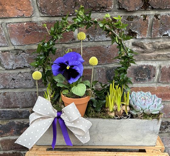 Mixed long wooden planter including mini narcissi, muscari, ivy, succulent and terracotta pot with pansey. (Colours may vary slightly )