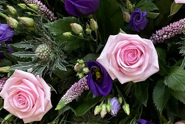 A picked from the garden style to give this design the perfect look using Roses, Veronica, Lisianthus and Sea Holly to create this beautiful single ended coffin spray. Sized at 75cm.