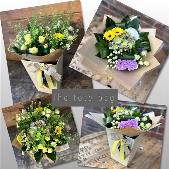 The perfect gift, a round handtied displayed in a tote bag style box in water with handles. available in a choice of colours.